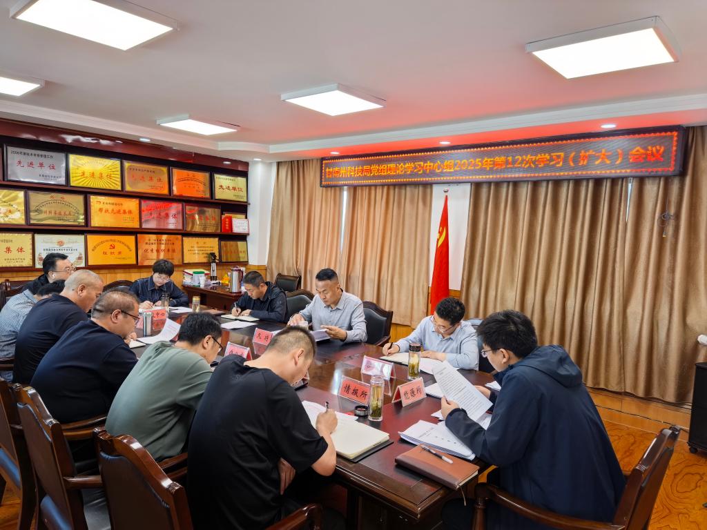 9月23日上午,甘南州科技局党组召开理论学习中心组2025年第12次学习(扩大)会议。党组书记、局长久特主持会议并讲话,全体班子成员参加会议,局机关各科室负责人及副科级以上干部列席会议。